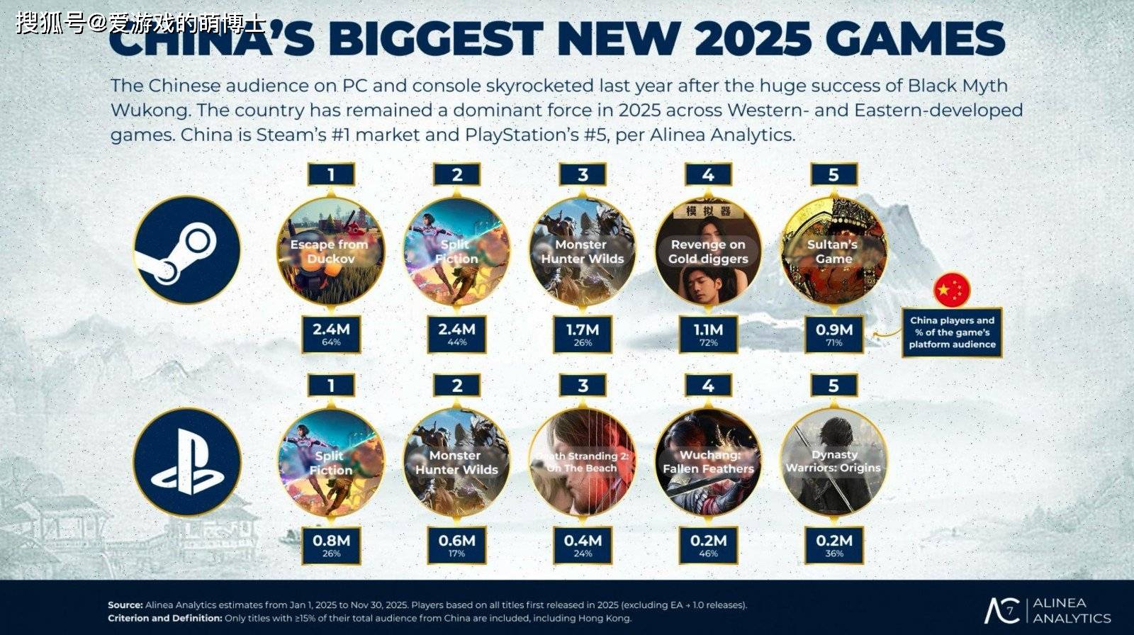 对于国内玩家来说,最值得关注的莫过于中国市场的全球地位——如今中国已是Steam最大市场,同时也是PlayStation第五大市场。从玩家偏好来看,Steam平台上中国玩家占比最高的热门作品依次是《逃离鸭科夫》(64%)、《双影奇境》(44%)、《怪物猎人:荒野》(26%);而PlayStation平台上,中国玩家占比前三的作品则是《双影奇境》(26%)、《死亡搁浅2》(24%)、《怪物猎人:荒野》(17%),硬核生存、叙事合作和狩猎类游戏显然更对国内玩家的胃口。