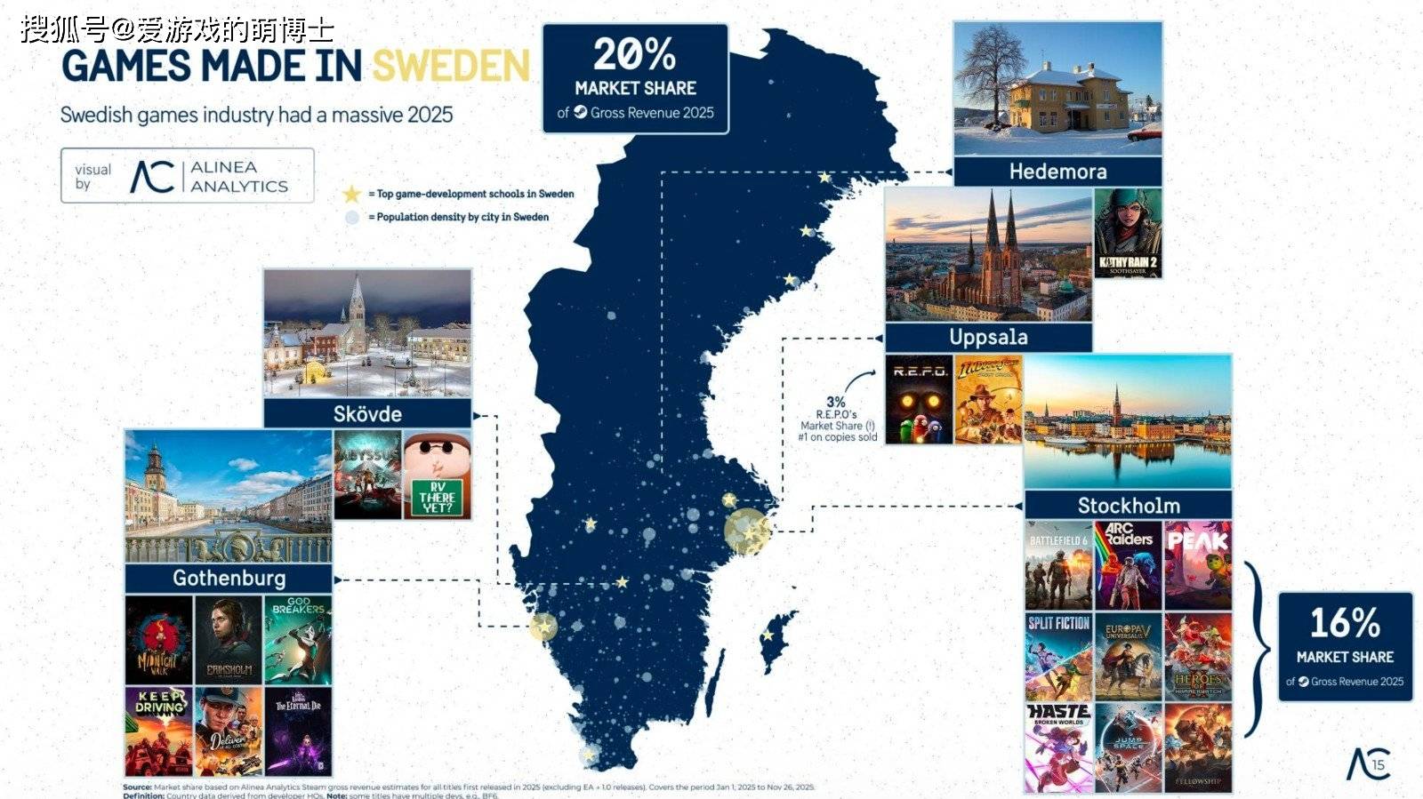 今年游戏市场最让人意外的惊喜,当属瑞典开发商的强势崛起。数据显示,瑞典作品占Steam年度总营收的20%,成为该平台今年营收最高的国家。更惊人的是,仅瑞典首都斯德哥尔摩开发的作品,就贡献了Steam全平台16%的营收,堪称“游戏产业高地”。斯德哥尔摩之所以能成为游戏开发重镇,离不开常年聚集的优质工作室。这里不仅有《战地》系列的核心开发团队DICE,成绩上面已经提到了;还有前DICE成员成立的Embark Studios(新作《ARC Raiders》大获成功)、以叙事合作游戏闻名的Hazelight Studios(《双影奇境》开发商)和Team PEAK(《Peak》开发商)。这些工作室覆盖3A大作、合作叙事等多个领域,共同撑起了瑞典游戏的半边天。